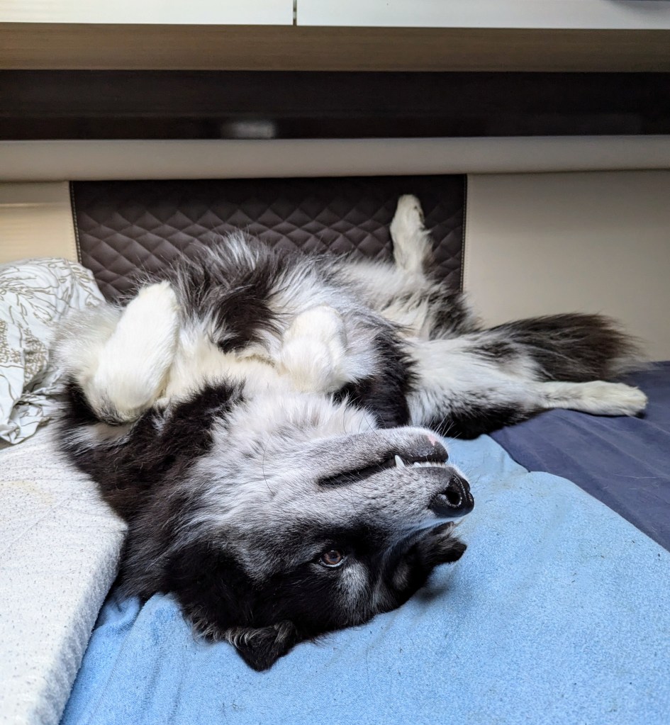 Geschlafen habe ich am liebsten auf meiner Outdoordecke. Morgens und abends habe ich mir auf dem Bett meine Kuschel- und Blödeleinheiten abgeholt.