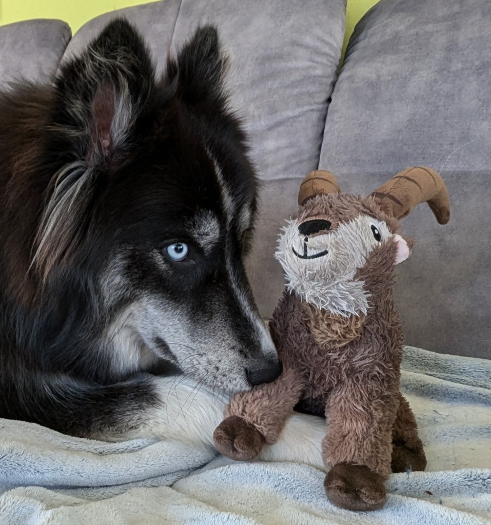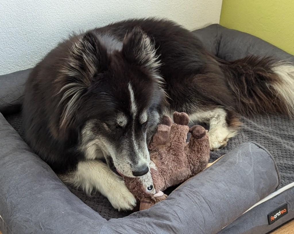 Ich liebe Spass, Spannung und Spiel. Und knabbern, knuddeln und kauen. Plüschis und Zerrspiele sind toll – noch toller in Kombination. Mit dem Seil-Beissring, den ich als Einstandsgeschenk in mein Arbeitsteam bekommen habe, machte ich kurzen Prozess. Und dem fluffigen Steinbock-Plüschi verging das dämliche Grinsen innert kurzer Zeit.